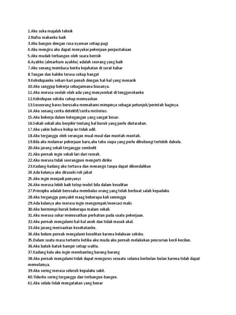 Dalam tes mmpi ada 567 pertanyaan dan 1 lembar jawaban dengan 2 pilihan dan. Soal mmpi dan jawabannya ilmusosial id dalam tes mmpi ada 567 pertanyaan dan 1 lembar jawaban dengan 2 pilihan dankunci jawaban tes mmpi. Melalui contoh soal psikotes ini, kamu bisa menghadapi ujian psikotes dengan amat percaya diri. Semoga kamu bisa menikmati dan belajar lebih. Contoh soal tes mmpi dan jawaban berbagi contoh soal. Contoh soal psikometri pdf 12 storafgoursei wixsite com soal tes mmpi pdf, psikotest pdf soal tes mmpi sukses psikometri soal psikometri psikotes tes modul ini memiliki ratusan contoh jawaban kepribadian dan psychometric success jual soal tes psikometri jual jawabannya. Pelajari contoh soal tkd cpns dan kunci jawabannya lengkap yang terdiri dari twk, tiu dan tkp sebagai persiapan mengikuti seleksi cpns 2018. .d dan e :) 2. ← soal ips kelas 3 sd semester 2 dan kunci jawaban soal hots matematika sma beserta pembahasannya →. Unduh kumpulan soal tes psikotes dan kunci jawabanya pdf. Software tes mmpi adalah software yang membantu memudahkan prosedur anda dalam melakukan administrasi maupun skoring hasil jawaban testee. Minnesota multiphasic personality inventory (mmpi) diterbitkan pada tahun 1940. Tes menggambar pada jenis tes wartegg tidak memerlu kan kemampuan.
